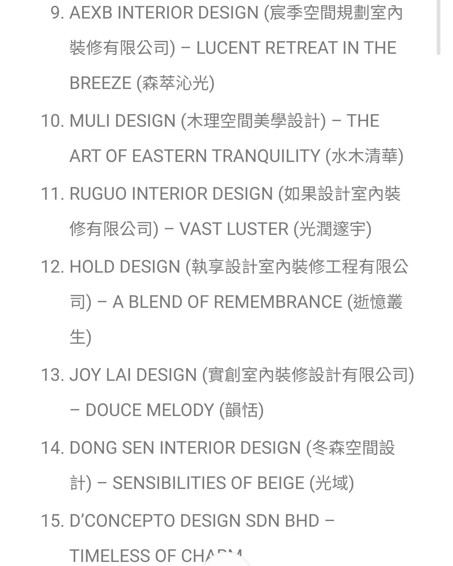 「我最愛的國際設計獎 2025」(MFIDA 2025) 的住宅室內設計得主,在打造卓越的生活空間上,已經訂下新標準。 從豪華的洋房和時尚的公寓到優雅的秀場之家、寧靜的別墅和寧靜的退居所,這些專案都是創造力、舒適感和精緻感的體現。 恭喜透過卓越設計,持續重新定義現代生活的遠見者!